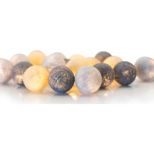 Iris Lights Greige lyskædeEn af vores personlige favorit-kombinationer i lyskæder med farvede kugler – her med fine grå nuancer blandet med en creme kugle som gør lyskæden enkel og rolig at kigge på, og så passer den til både det stilrene og farverige hje